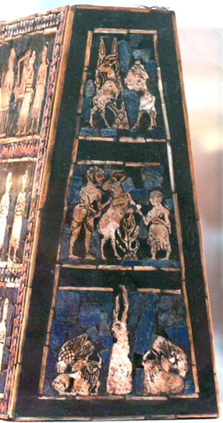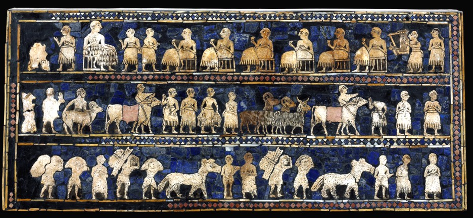 The 'Peace' panel depicts animals, fish and other goods brought in procession to a banquet. Seated figures, wearing woollen fleeces or fringed skirts, drink to the accompaniment of a musician playing a lyre. Banquet scenes such as this are common on cylinder seals of the period, such as on the seal of the 'Queen' Pu-abi.