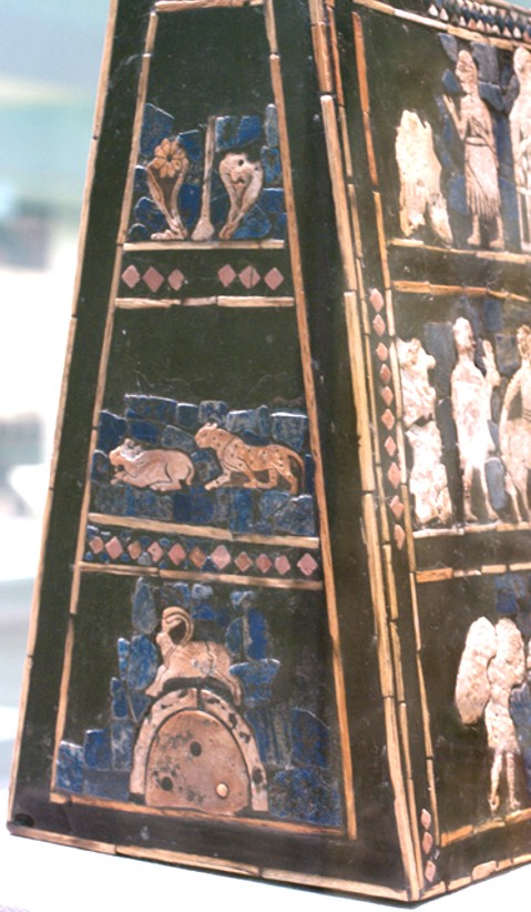 The Standard of Ur was found in PG779 one of the largest graves in the Royal Cemetery at Ur by Leonard Woolley (1920s), the excavator at Ur. It was lying in the corner of a chamber above the right shoulder of a soldier whom Woolley thought had carried it on a long pole as a standard, the royal emblem of a king: hence its common name. It is essentially a hollow wooden box measuring 8.5 inches high and 19.5 inch long, inlaid with a mosaic of shell, red limestone, and lapis lazuli set in bitumen. Its original function is not yet understood, although it is more likely to have been the sound box for a musical instrument.