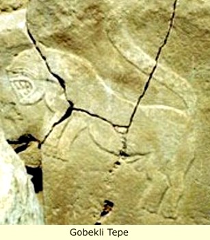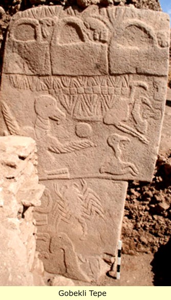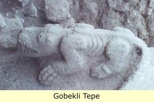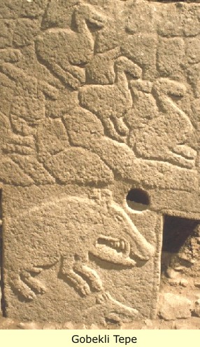 To date, the most astonishing find is at Göbekli Tepe (Turkish for "Hill with a Tummy"), which is a hilltop sanctuary built on the highest point of an elongated mountain ridge about 15km northeast of the town of Şanlıurfa (Urfa) in southeast Turkey. This site, currently undergoing excavation by German and Turkish archaeologists, is said to have been erected by hunter-gatherers at perhaps 11,500 B.C. This is believed to be before the advent of sedentism (permanent year-round settlement). That claim however, does not seem logical. Note the finely carved pillars to support the roof, it doesn't seem like Hunter Gatherer Nomads would have acquired the skills to do such work. What use would Hunter Gatherer Nomads have for such a structure? Hunter Gatherer Nomads did not store food, they moved to find food, how would Hunter Gatherer Nomads feed themselves while building the site? In any event, it is currently considered the oldest known shrine or temple complex in the world. And the planet's oldest known example of monumental architecture.