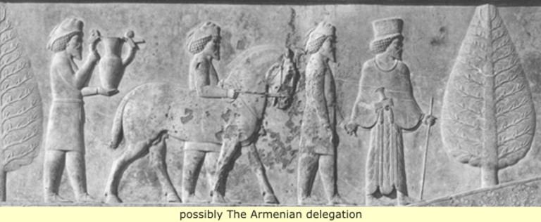 The Hayk, as the Armenians name themselves, were not able to achieve the power and independence of their predecessors (the Hatti, Urartian’s), and were first rapidly incorporated by King Cyaxares into the Median empire, and then annexed with Media by King Cyrus II, to form part of the Achaemenian Persia Empire (550 B.C.). The country is mentioned as Armina and Armaniya in the Bisitun inscription of Darius I (522 B.C.), and according to Herodotus, formed part of the 13th satrapy (province) of Persia; the Alarodioi forming part of the 18th. Xenophon's Anabasis, recounting the adventures of Greek mercenaries in Persia; describes the local government of Armenia, at about 400 B.C, as being in the hands of village headmen, part of whose tribute to the Persian king, consisted of horses. Armenia continued to be governed by Persian or native satraps until its absorption into the Macedonian empire of Alexander the Great (331 B.C.) and its successor, the Seleucid empire (301 B.C.).
