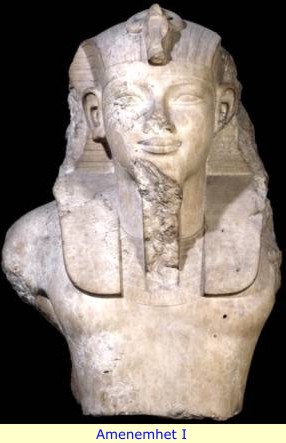 Amenemhet I appears to have been a wise leader, he set about to correct the problems of the First Intermediate Period, and he took steps to protect Egypt's boarders from invasion and to assure a legitimate succession, {he was the first king to establish a co-regency with his son, Senusret I}. Yet he was murdered in an apparent harem plot, while his co-regent was leading a campaign in Libya. We find two literary works, the Tale of Sinuhe, and the Instructions of Amenemhet I, reflecting this king's tragic end. One literary work from the time of his son Senusret I, presents the account of Amenemhet I's murder, supposedly provided by the king himself from beyond the grave: