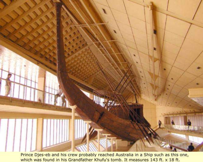 In Australia, there is a stella and writings chronicling the trials and travails of Khufu's grandson "Prince Gjes-eb", who had been shipwrecked in Australia. The chronicle tells of how the prince had been bitten by a poisonous snake and died, and that the rest of the crew was without hope. But, something really curious here, in the chronicle the writer says, "For two seasons he made his way westward, weary, but strong to the end". Where could they have been coming from, where after "two seasons", they had still only made it to as far west as Australia? Click here for the full text of the Egyptian Ship-wreak in Australia. <<Click>>
