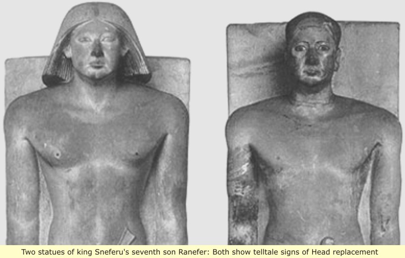 Of course, there is now way that face could belong to king Sneferu's seventh son Ranefer. So what happened? Liars rarely have much imagination, so they continually do the same things, and so it is with Ranefer's statue. As with Hemiunu's statue, those pathetic liars simply placed a head with a White face on it. Note the fuller pictures of Ranefer's statues below, both show signs of head replacement/modification.