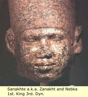 SanakhteSo now, we are back in Egypt and by now Egypt has been moving right along, it has gone through two dynasties and many kings. Its religion has become more refined, its society even more organized, and much more affluent. We start with Sanakhte, uncertainty swirls around the placement, and also the events of the 3rd Dynasty king known as Sanakhte (Sanakht). He may have been Nebka, who was known to manetho, and listed on both the Turin Cannon and the Abydos king list as the first king of this dynasty. However, this is problematic to say the least, for we base our belief that he was Nebka on a source that lists his Horus name Sanakhte, together with a second name that ends with the element "ka".