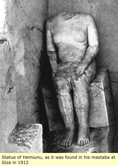 Hemiunu was a son of prince Nefermaat, son of King Snofru. He is believed to be the architect of the Great Pyramid of Giza, Egypt. Below is his uncle, King Khufu.