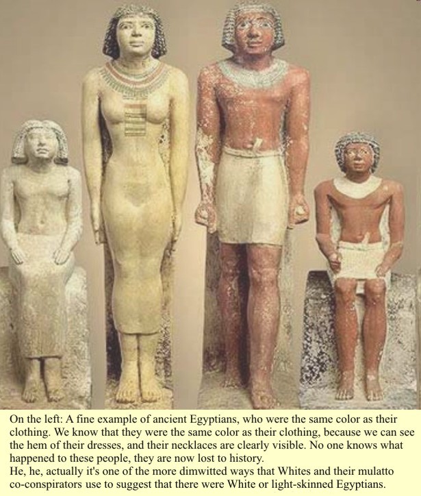 Egyptians, Sumerians, Mohenjo-daroans, Harappans, and Cretans, Elamites, and Nubians, were literate 3,000 years, 4,000 years, who knows how many thousands of years, before the world ever heard of Greeks or Romans. And there is ample evidence of their literacy.Yet there is not one single entry: describing any of the people of their times, whether it be friends, foes, or invaders: or even more incredulously, there is not one single entry describing invading Whites in any of their literature.Contrast that with Greek and Roman writings, in which these NEWLY literate people, describe EVERYTHING and EVERYONE!The discrepancy is of course, not accidental, nor for lack of material.Hopefully, the White man has simply withheld this material, and not destroyed it. |