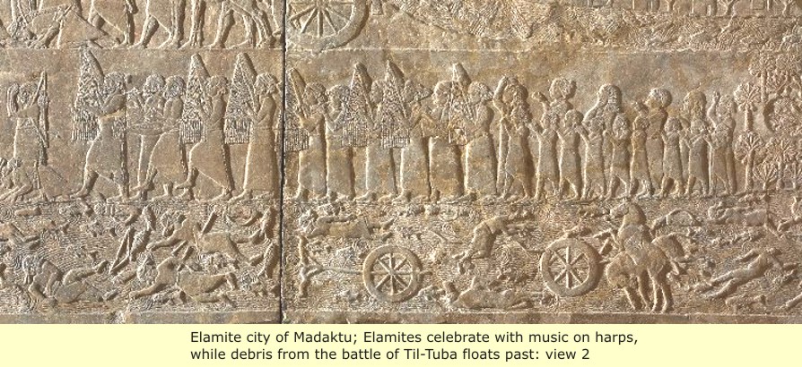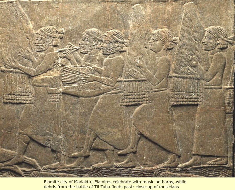 Before the captive prince were gathered a number of the Susianians, probably the subjects of the slaughtered king, who had come to surrender the Assyrian general, for they still carried their arms, and were not led by the victorious warriors. Some of them knelt, some bowed to the ground, and others, stretched at full length, rubbed their heads in the dust, all signs of grief and submission still practised in the East. They were followed by a led horse, and by a cart drawn by a mule, resembling those represented in the battle scenes. Another Tartan of the Assyrian army, holding his war-horse and carrying his spear, also received the homage of the conquered Susianians. The Assyrian generals were welcomed by bands of men and women, dancing, singing, and playing on instruments of music....