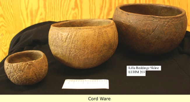The Corded Ware culture receives its name "Corded Ware" from the frequent use of decorative cord impressions on the pots, which differed from the earlier Pit-Comb Ware culture, Single Grave from its burial custom, and Battle Axe from its characteristic grave offering to males, a stone battle axe (which was by this time an inefficient weapon, but still a traditional status symbol).