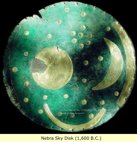 The 32-centimeter disc and weighs approximately 2 kilograms is decorated with gold leaf symbols that clearly represent a crescent moon, a circle that was probably the full moon and starts. A cluster of seven dots has been interpreted as the Pleiades constellation as it appeared 3,600 years ago, scattered other stars and three arcs, all picked out in gold leaf from a background rendered violet-blue -- apparently by applying rotten eggs. The formations on the disc are clearly based on previous astrological observations and that astronomical knowledge was tied to a mythological-cosmological worldview right from the beginning.