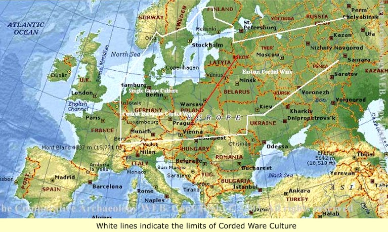 The Corded Ware culture is an enormous European archaeological horizon that begins in the late Neolithic (Stone Age), flourishes through the Copper Age and finally culminates in the early Bronze Age, developing in various areas from about 3200 B.C. to 2300 B.C. It represents the introduction of metal into Northern Europe. Corded Ware culture is commonly associated with the Indo-European family of languages.