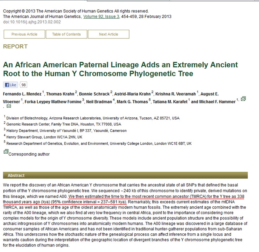 Note: We now know that the separation time of 120,000 years ago, is wildly incorrect. The earliest separation was at about 60,000 B.C, when the out-of-Africa (OOA) migrations began.