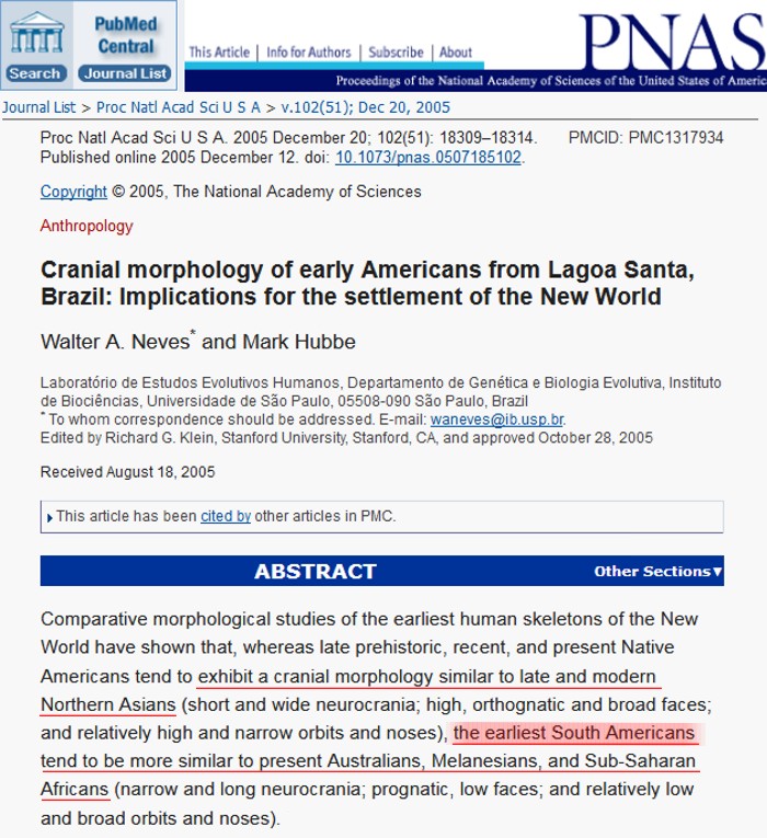 Quote: Neves and Blum (2000) are testing the recent claim that craniofacial observations of the Buhl Paleoindian remains are similar to other North American and East Asian (Chinese) populations. The measurements of the Buhl skull were compared to twenty-six modern populations (Howells), and to a Paleoindian skull from Lapa Vermelha, Brazil, which shows morphological similarities with Africans and Australians. Multivariate analysis shows that there is a great difference between the Paleoindian skulls, and when compared to the modern populations the skulls belong to different clusters. They suggest that at least two populations peopled the Americas; one with characteristic "Mongoloid morphology," and another with a generalized morphology. (Note that the European Albino is a mere 8-10% of the Human population - generalized does NOT mean them)!