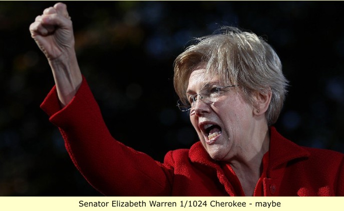 "Using a DNA test to lay claim to any connection to the Cherokee Nation or any tribal nation, even vaguely, is inappropriate and wrong," the statement said in part. "It makes a mockery out of DNA tests and its legitimate uses while also dishonoring legitimate tribal governments and their citizens, whose ancestors are well documented and whose heritage is proven. Senator Warren is undermining tribal interests with her continued claims of tribal heritage." Most tribes use their membership rolls dating back decades, requiring a direct descendant or blood quantum. Warren claims Cherokee and Delaware heritage - both of which use membership rolls to determine who qualifies for tribal citizenship, which Warren has never claimed. Cherokee Nation principal chief Bill John Baker is 1/32 Cherokee by blood. (Only in a world run by other Albinos could such ridiculousness exist).