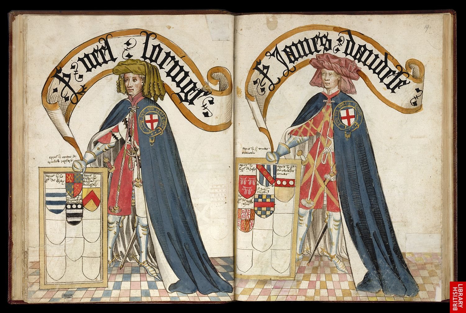 | Full page miniature of John, Lord Mohun (unfinished), and Sir Thomas Holland (unfinished), of the Order of the Garter, each unfinished and wearing a blue Garter mantle over plate armour and surcoat displaying his arms. A framed tablet displays painted arms of successors in their Garter stall at St. George's Chapel, Windsor. |