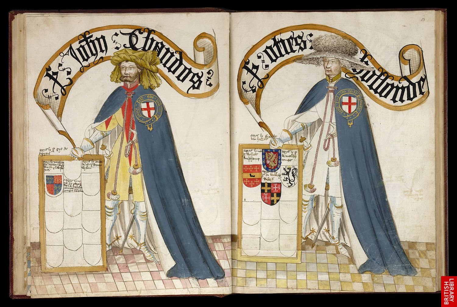 | Full page miniatures of Sir John Chandos and Sir Otes Holland (unfinished), of the Order of the Garter, each wearing a blue Garter mantle over plate armour and surcoat displaying his arms. A framed tablet displays painted arms of successors in their Garter stalls at St. George's Chapel, Windsor. |