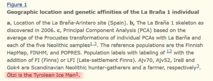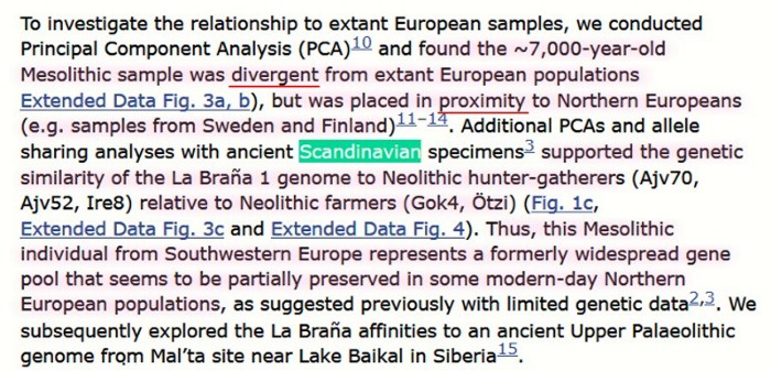 Quote: To investigate the relationship to extant (current) European samples, we conducted a principal component analysis (PCA)10 and found that the approximately 7,000-year-old Mesolithic sample was divergent from extant European populations (Extended Data Fig. 3a, b), but was placed in proximity to northern Europeans (for example, samples from Sweden and Finland) 11–14. Additional PCAs and allele-sharing analyses with ancient Scandinavian specimens 3 supported the genetic similarity of the La Bran˜a 1 genome to Neolithic hunter-gatherers (Ajv70, Ajv52, Ire8) relative to Neolithic farmers (Gok4,Otzi) (Fig. 1c, Extended Data Figs 3c and 4). Thus, this Mesolithic individual from southwestern Europe represents a formerly widespread gene pool that seems to be partially preserved in some modern-day northern European populations, as suggested previously with limited genetic data2,3.