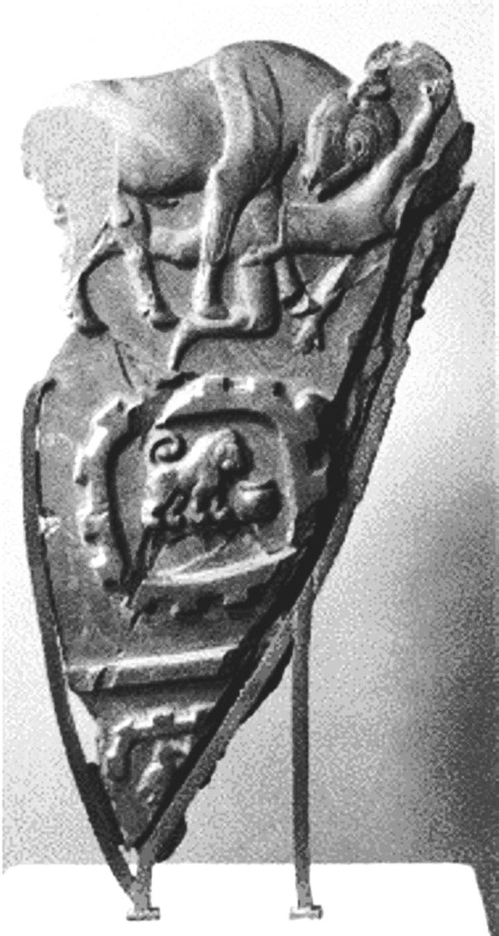 Below the figure of the king depicted as a rampaging bull, two captured towns are shown as fortified enclosures with their names written inside. These names are among the earliest examples of hieroglyphic writing and have not yet been deciphered.