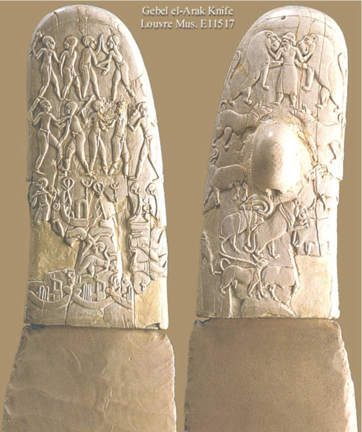 This flint knife with a carved ivory handle was found near Denderah. It is one of the oldest examples of bas-relief carving. The whole knife is 25 cm, the handle about 10 cm long.