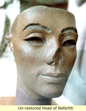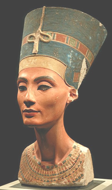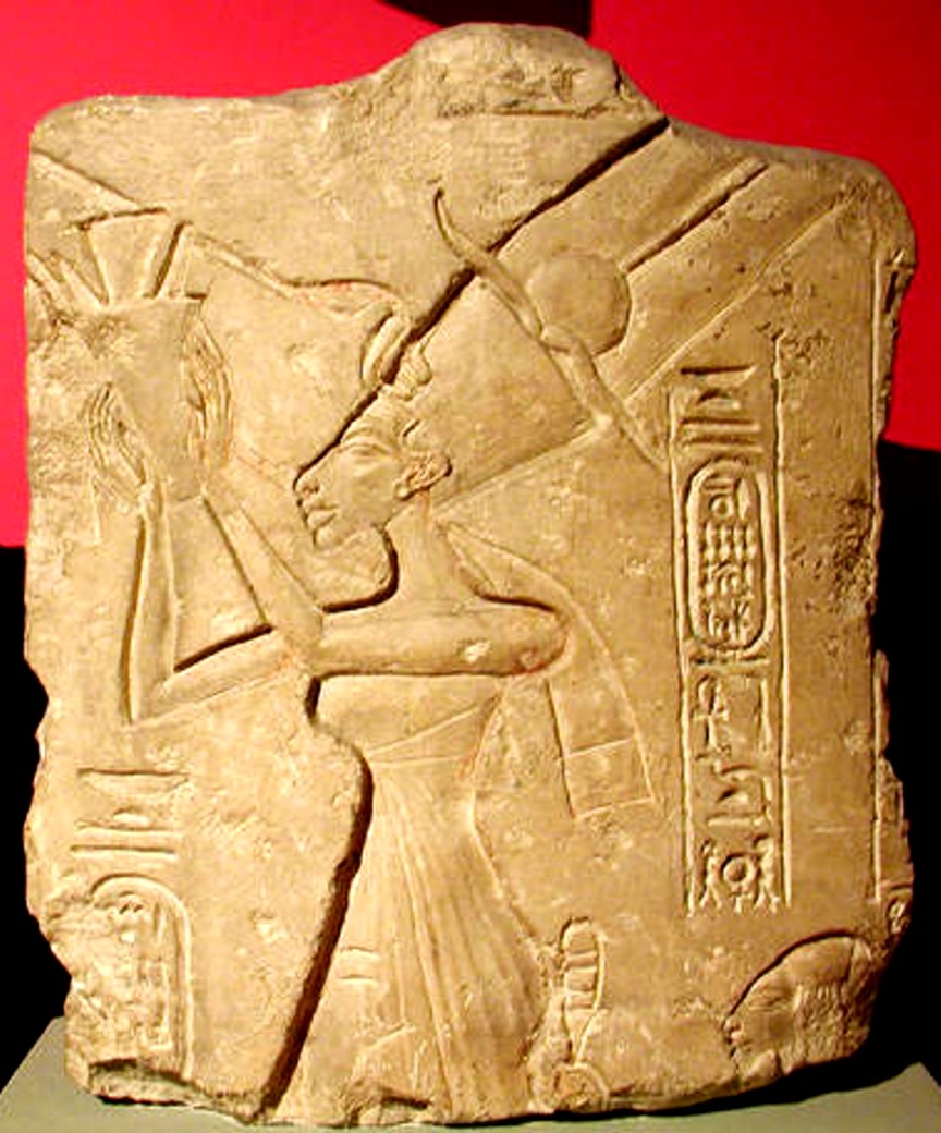 Limestone column fragment from Amarna showing Queen Nefretiti making offerings to the Aten (below).
