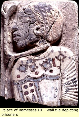 The Peleset and Tjeker (Minoans) of Crete, they would later be known as the “Philistines” after they had settled in Southern Canaan. Over time, this area became known by a form of their name “Palestine”. The Lukka who may have come from the Lycian region of Anatolia, The Ekwesh and Denen who seem to be identified with the original (Black) Greeks, The Shardana (Sherden) who may be associated with Sardinia, The Teresh (Tursha or Tyrshenoi), the Tyrrhenians - the Greek name for the Etruscans, and The Shekelesh (Sicilians?).