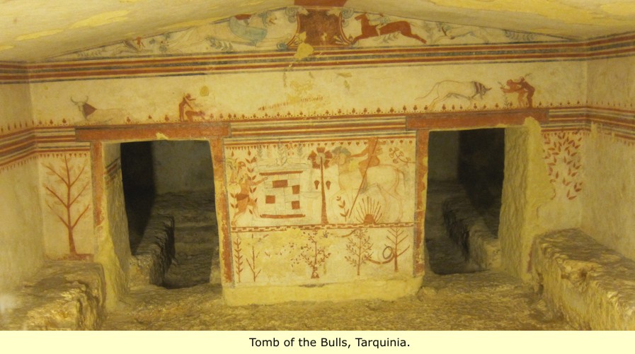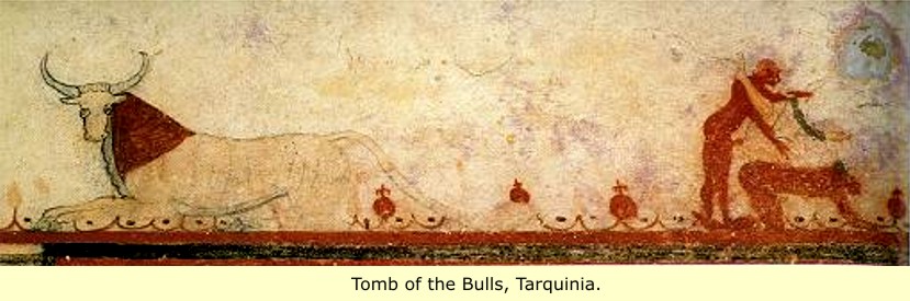 The Tomb of the Bulls is an Etruscan tomb in the Necropolis of Monterozzi near Tarquinia, Italy. It is dated to 540–520 BC or 530–520 B.C. and was apparently commissioned by Arath Spuriana according to an inscription. The tomb is named after the two bulls which appear on one of its frescoes. It is the earliest example of a tomb with complex frescoes in the necropolis.