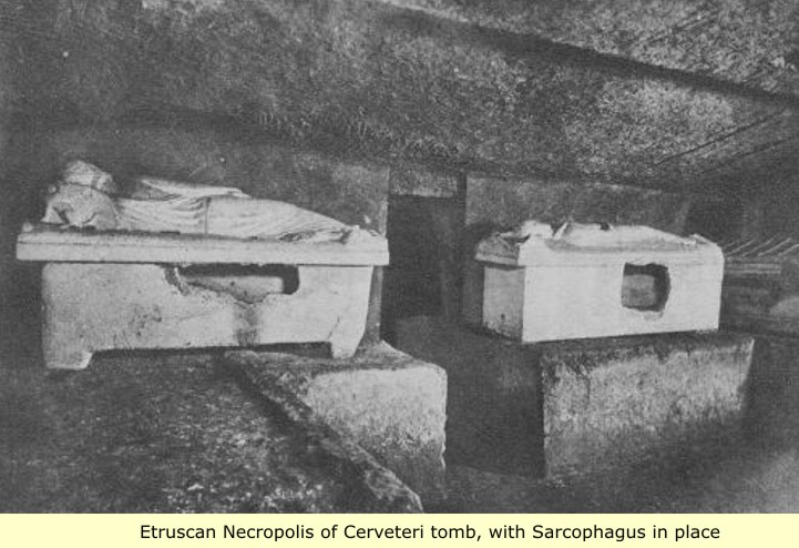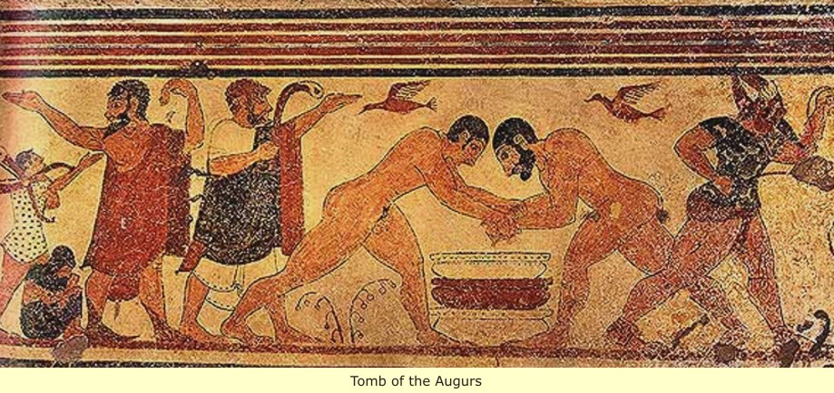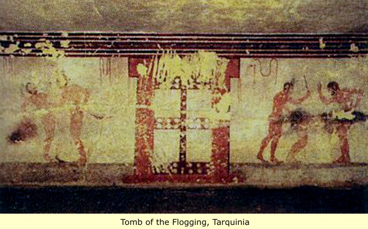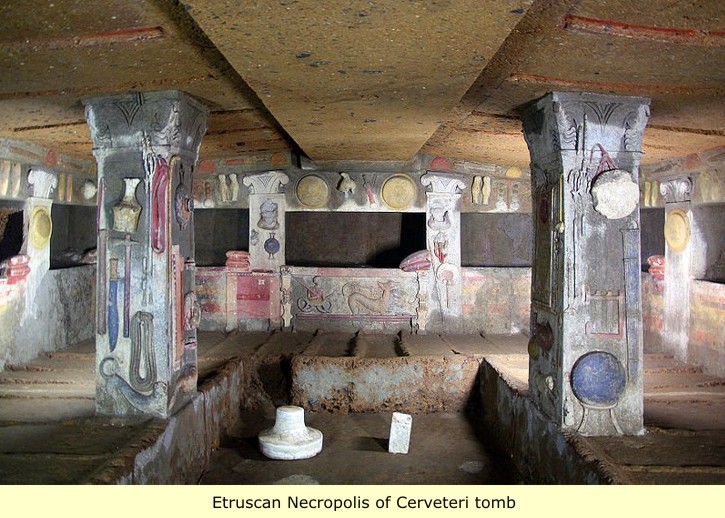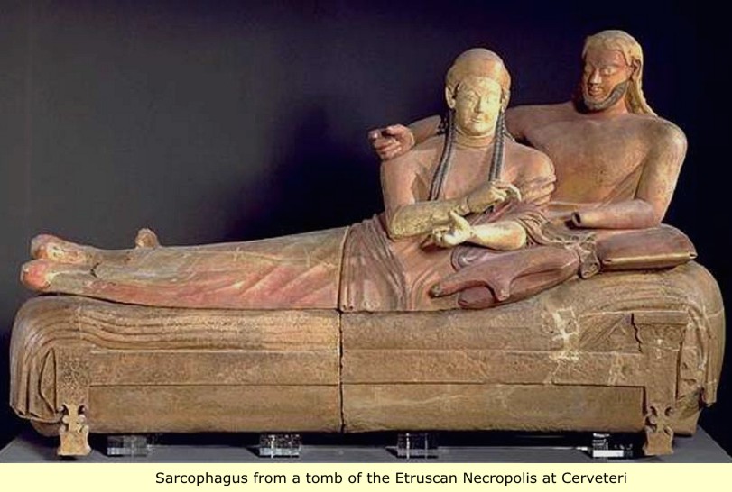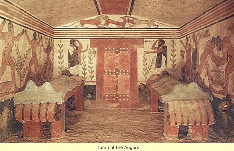 Etruscans, like Egyptians, painted their burial chambers with scenes reminiscent of fond activities during life, and scenes hopeful of a pleasant afterlife. The Tomb paintings also suggest; that sometime after Latin conquest of the Etruscans, relations between the two peoples became normalized. This is indicated by the prevalence of later bi-racial tomb scenes, as well as the changing appearance of the Etruscans themselves. As evidenced by tomb paintings and sarcophagus' bi-racial marriages were common.