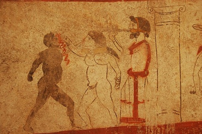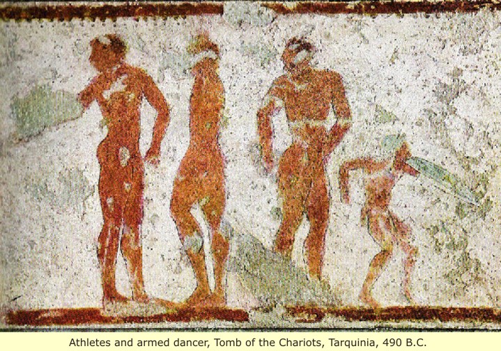 | Dancers, Tomb of the Lionesses, Tarquinia, 520 B.C. The young man carries a metal olpe, or jug, and in the young lady's right hand are castanets. |
