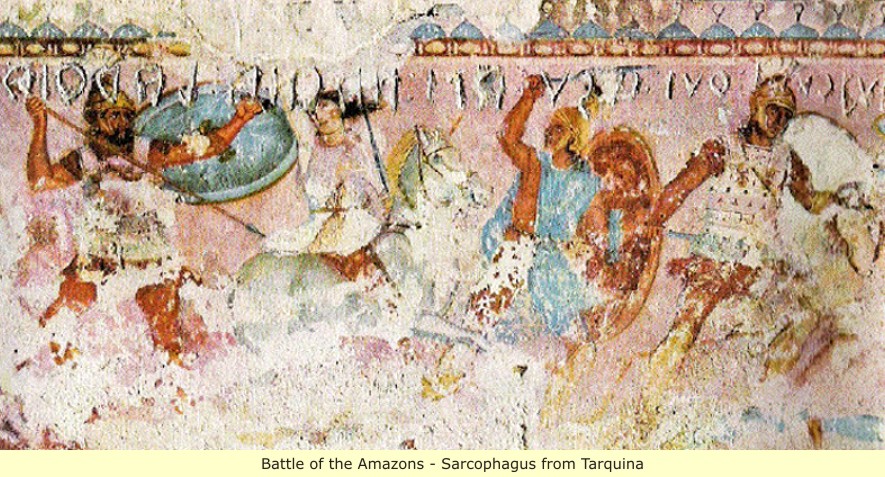 | "Battle of the Amazons," Sarcophagus from Tarquina, Archeological Museum, Florence. Photo from Skira, Inc., Etruscan Painting, 1952. This painting obviously involves a woman and warriors, and the text should explain who is involved and what is happening in the scene. The woman does not appear to be wearing armor, and the semi-naked warrior in blue also has no armor, has a Phrigian helmet, and brandishes a sword towards the woman. On the other side of the woman is an armored soldier pointing a spear at the woman. The armed man, carring a bow, on the far right is actually leading the group away. The scene suggests the capture of the woman, not necessarily a battle. It may depict an abduction. |
