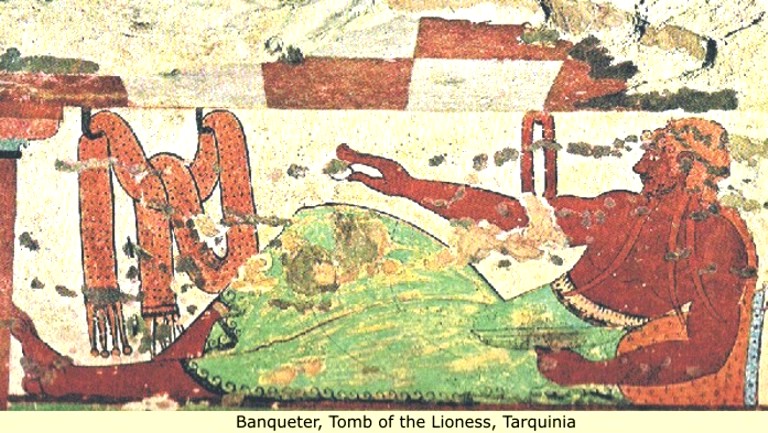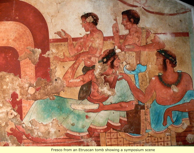 | Tomb of the Baron, Tarquinia, circa 510 B.C. The deceased may be the woman to whom the drink is being offered. Note the wreaths or ring, a common device, and the Hippocampus and dolphins. |