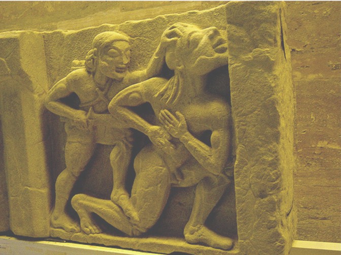 Francesca Giustiniani Tomb, Tarquinia, circa 5th century B.C. The man holds a crook in his left hand. Not seen in this image, to the left of the woman, is a chariot, and the woman may be protesting his departure in the chariot. |