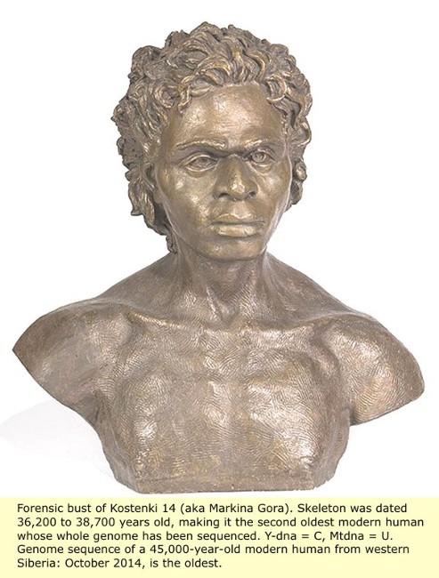 It is estimated that "Modern Humans" (Africans) started to leave Africa to populate the rest of the world at around 60-70 thousand B.C. Those first settlers took a coastal course to East Asia where some turned Northward to wind-up in what we call Siberia and China. Others turned South to wind-up in Australia. This is what they looked like.