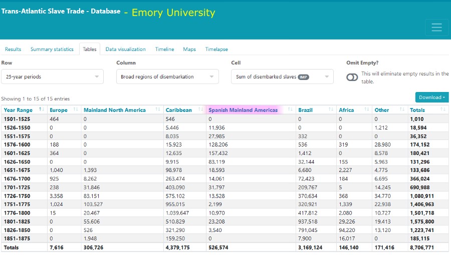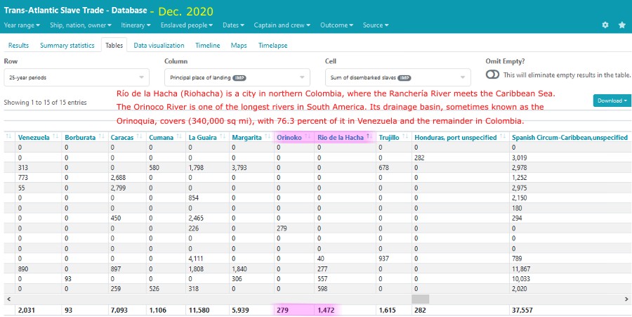 The Slave Voyages Consortium at Emory University has been updated for 2021.The latest version is Slave Voyages v2.2.13. A facsimile of the Table of number ofSlaves landed, and where they were disembarked, and the associated Map, is located here: Click>>>
